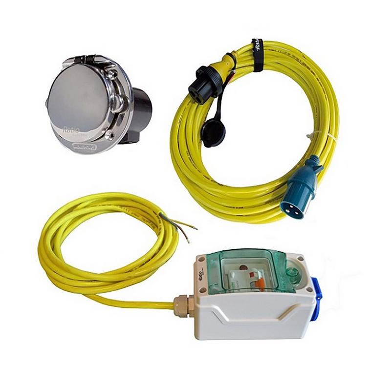 Komplett kit: Innehåller elcentral, rostfritt elintag och landströmskabel på 15 m.