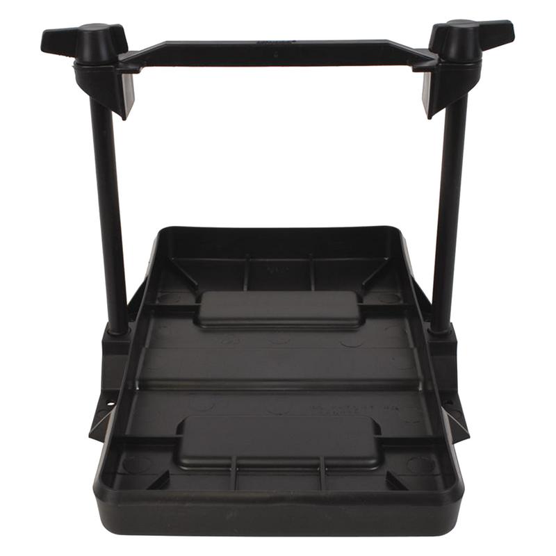 Levereras med tvärstång som är justerbar i höjd för att hålla fast batteriet.