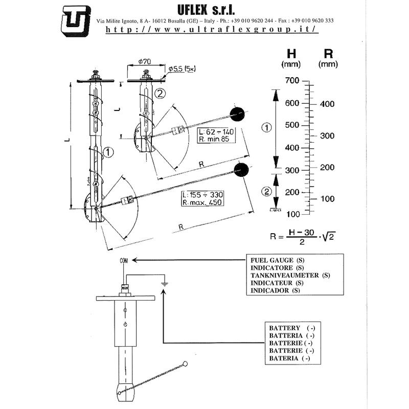 Hävarmsgivare. Passar samtliga instrumentfabrikat, VDO, Wema, Uflex, Faria mm. Ställbar för olika tankdjup. Traditionell flänsring med "VDO-hålbild". När ohm-värdet anges börjar man med bottenvärdet på givaren.