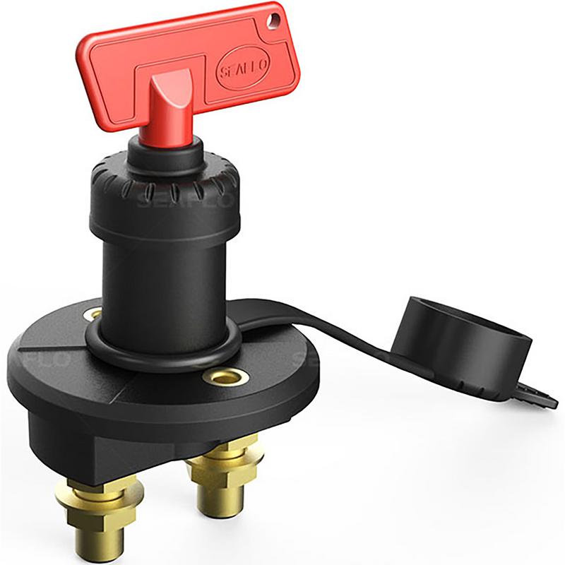 Huvudströmbrytare med löstagbar nyckel. Max belastning: 500A i 10 sekunder. 100A under kontinuerlig drift.