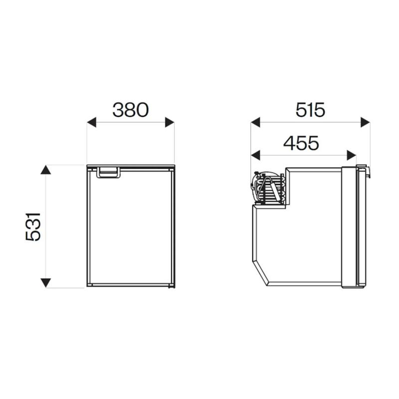 Isotherm CR49 med samma "standard"-yttermått som CR 42, med kompressorn fast monterad bakom frysfacket. Ryms även liggande eller stående 1 1/2-liters PET-flaskor.