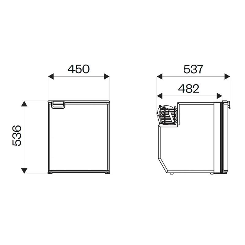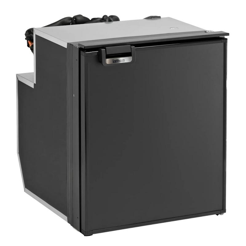 Isotherm CR65 har ett frysfack på 4 liter med lucka. Det rymmer liggande och stående PET-flaskor och mjölkpaket. Inbyggd kompressor som ger slät ryggsida.