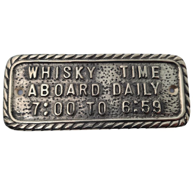 Mässingsskylt med texten: Whisky time aboard daily 7:00 to 6:59