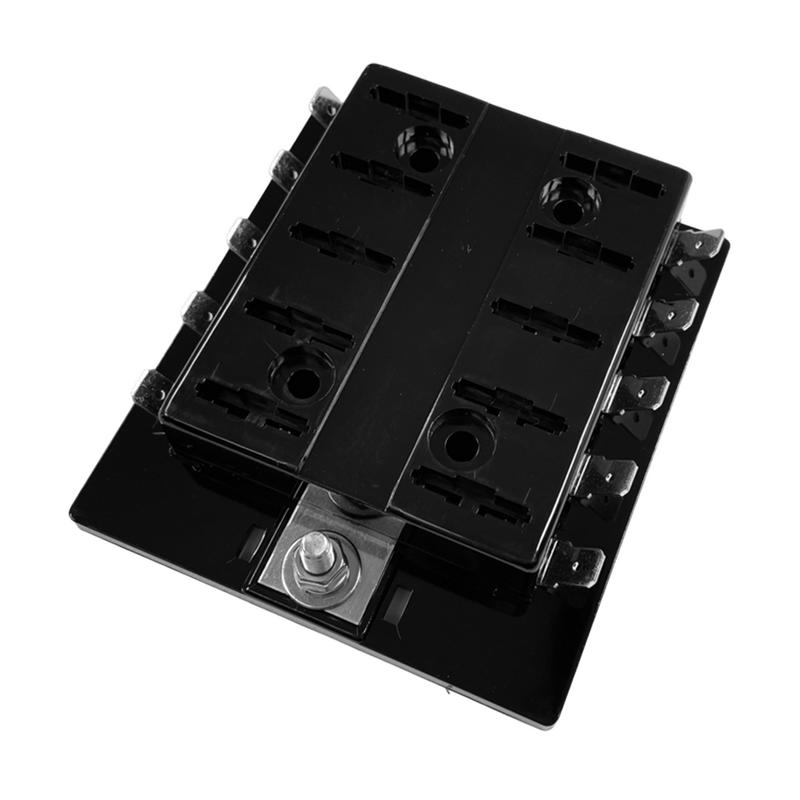 Säkringsbox med en ingående plus (+) och plats 10st flatstiftsäkringar med max 25A/utgång.