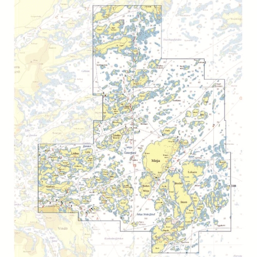 Lådna - Husaröleden - Möjaskärgården. A3-format. Utförandet är synnerligen påkostat med tryck på stryktålig och helt vattensäker plast och med ett omslag som gör produkten i det närmaste oförstörbar.