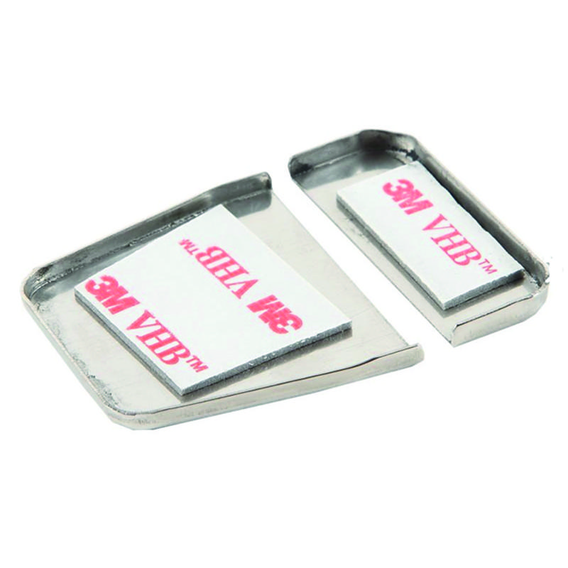 Luckgångjärn med rostfri platta som med dubbelhäftande 3M-tejp döljer skruvhuvuden.